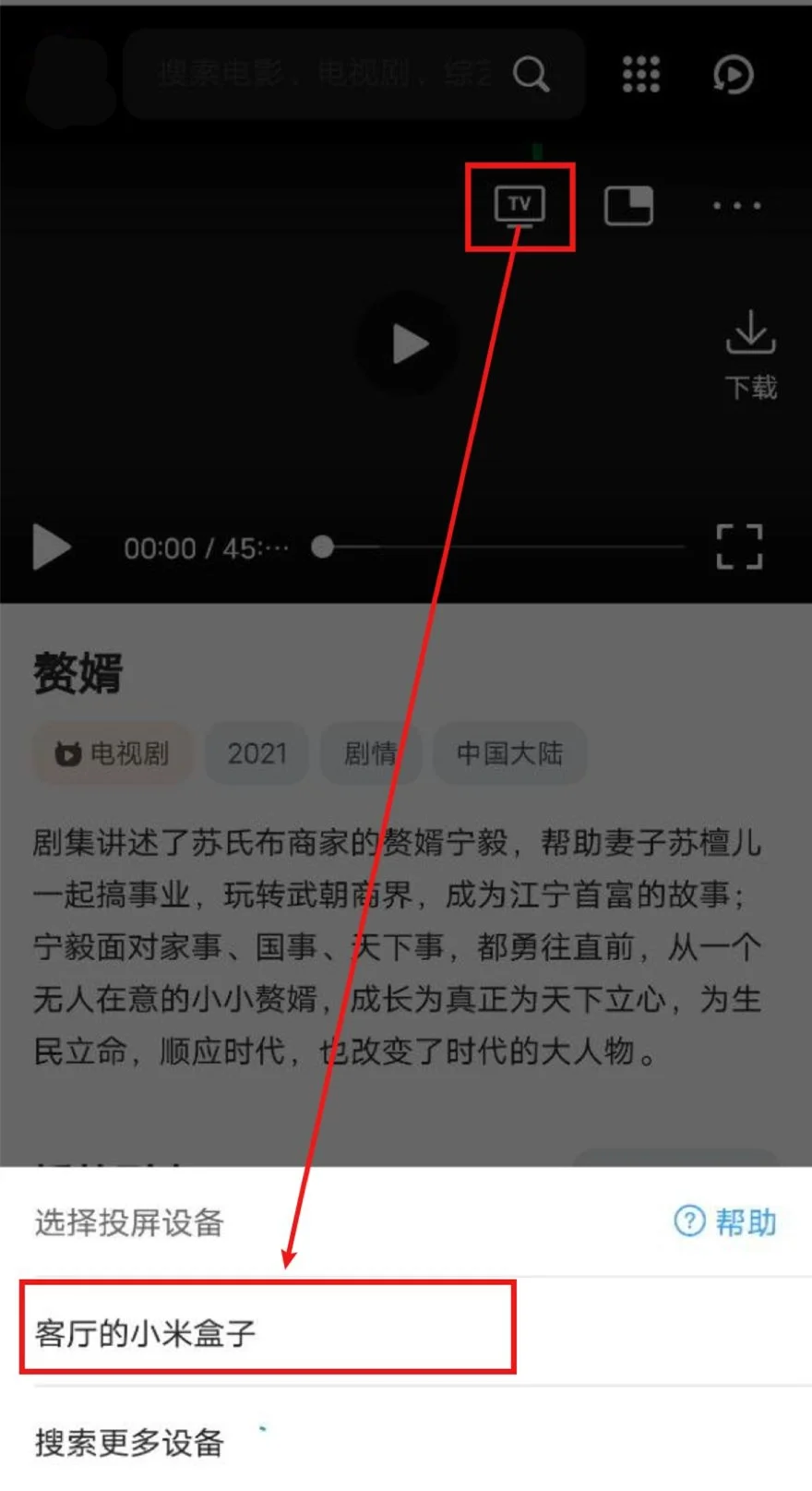 打开QQ浏览器(会接管网页播放器)->打开内部视频->播放视频->选中投屏图标->等待搜寻出智能电视/电视盒子->选中,即可投屏。